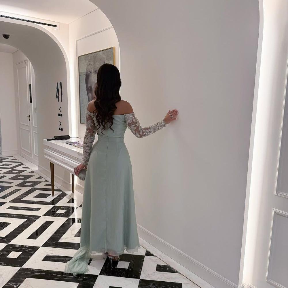 فستان سهرة بلون المينت (الأخضر البارد) الساحر، يتميز بتصميم “أوف شولدر” يبرز جمال العنق، مع أكمام من التل الشفاف المطرز يدوياً بنقوش أوراق الشجر الكريستالية. تصميم يمنحكِ رقياً استثنائياً بلمسات عصرية هادئة.