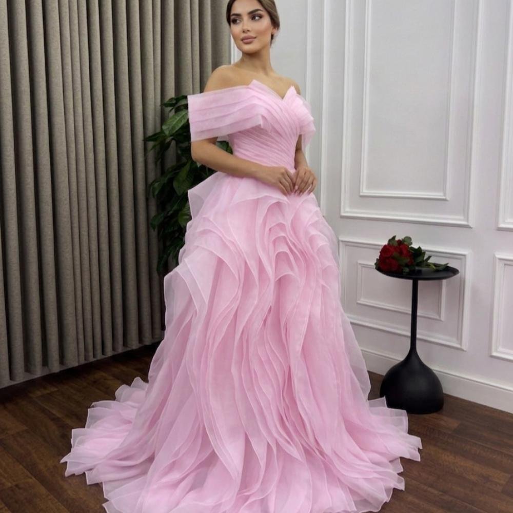 فستان سهرة وردي طويل فاخر بتفاصيل تول متموجة