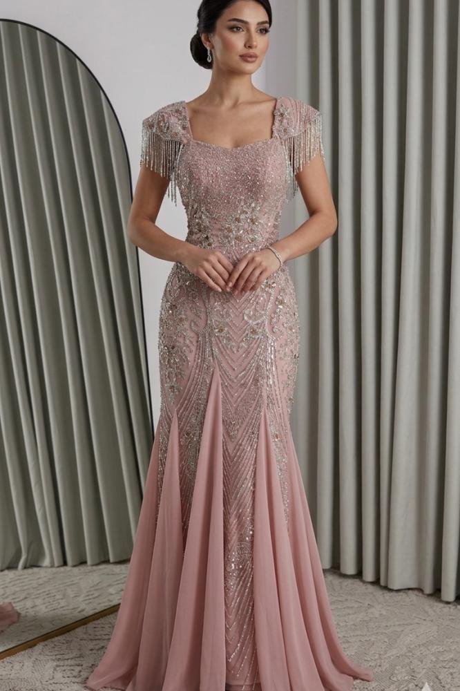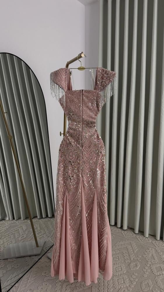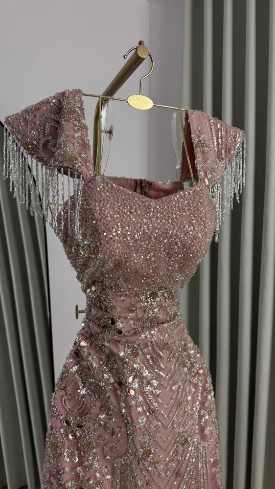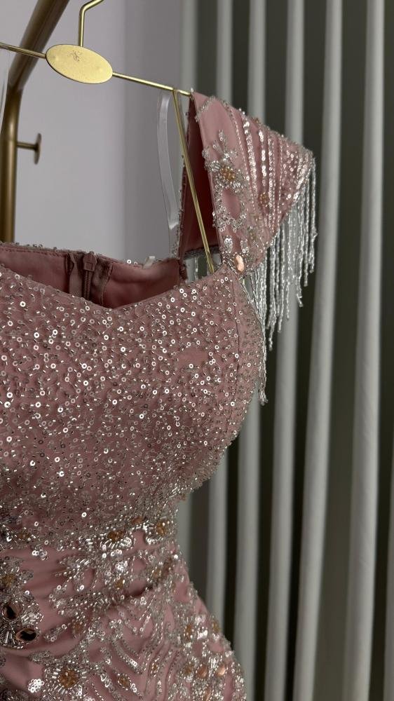فستان سهرة وردي فاخر بتطريز كريستال لامع وقصة مجسمة تبرز الخصر بأناقة، مع أكتاف مزينة بشراريب راقية وشق أمامي ناعم يمنحك فخامة وجاذبية في كل خطوة. مثالي للخطوبة والسهرات والمناسبات الكبرى.