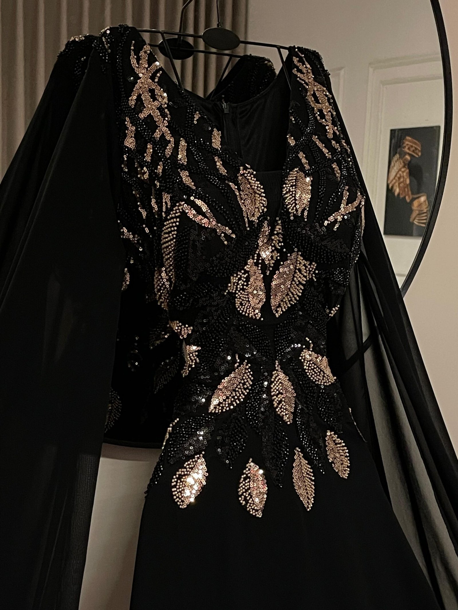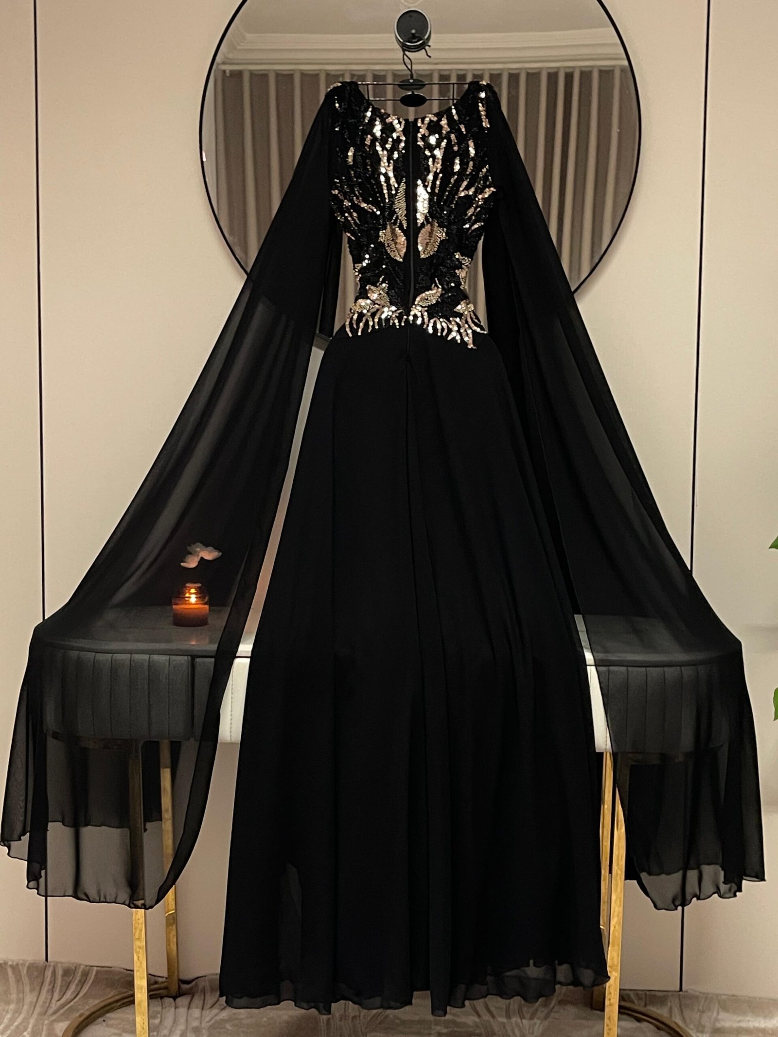 فستان من خامة الشيفون مع كلفة خرز مطعمه باللون الذهبي