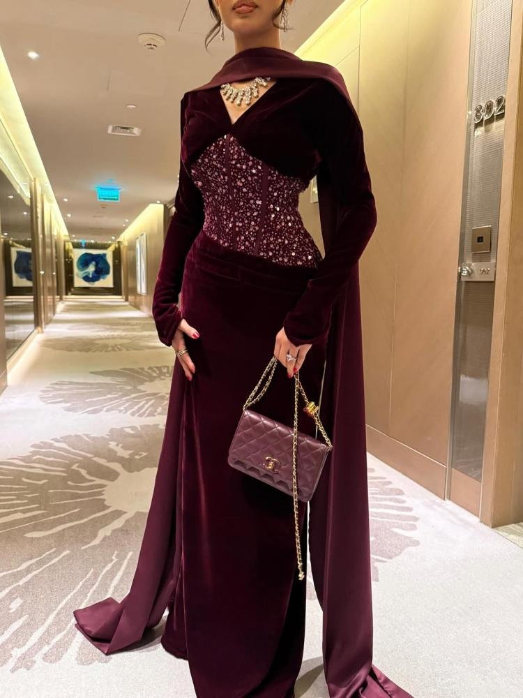 فستان خمري فاخر يهمس بالفخامة قبل أن يتكلم، تصميم يأسر الحواس ويجسد الأنوثة بقوة ناعمة. قصة الكورسيه المطرزة بالترتر الدقيق تنحت الخصر بإغراء محسوب، وتمنح القوام حضورًا ملكيًا لا يُقاوم، بينما ينساب المخمل الغني بانسيابية ساحرة تعكس الضوء بعمق آسر.