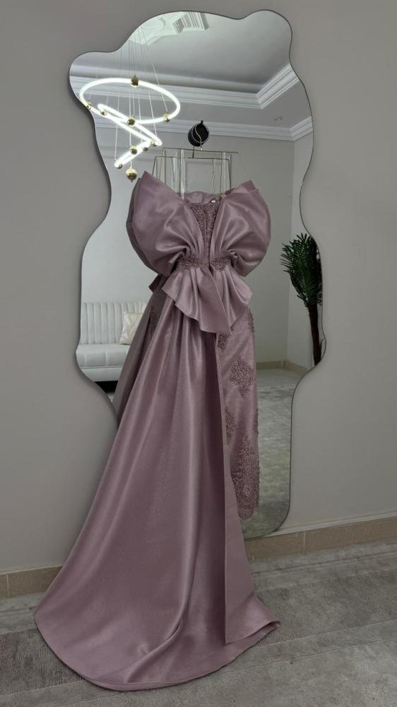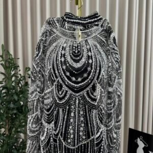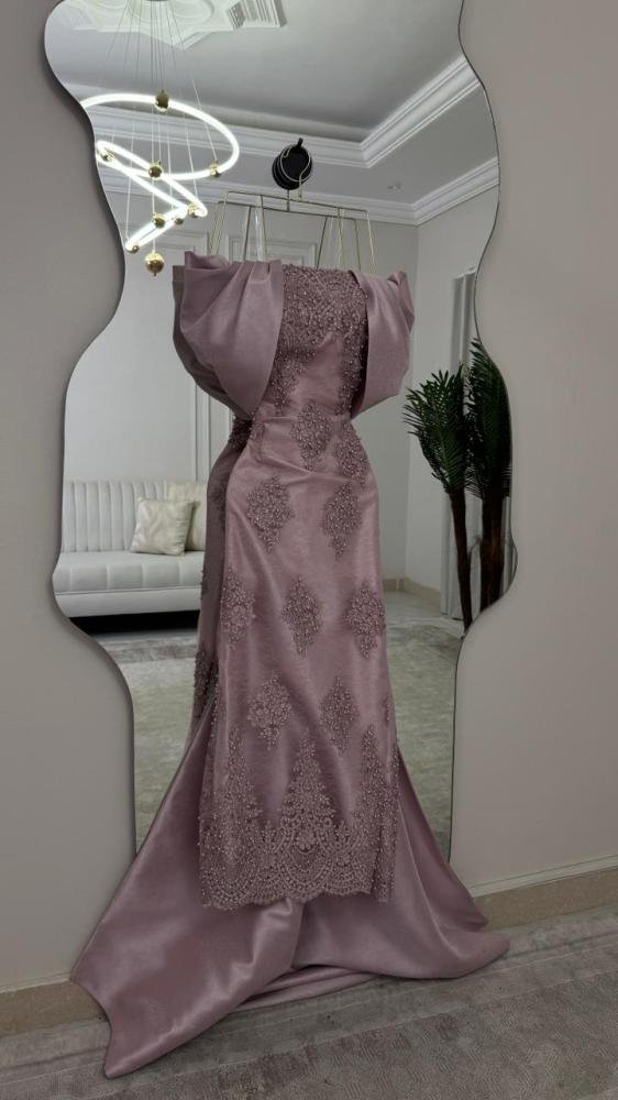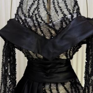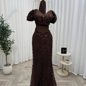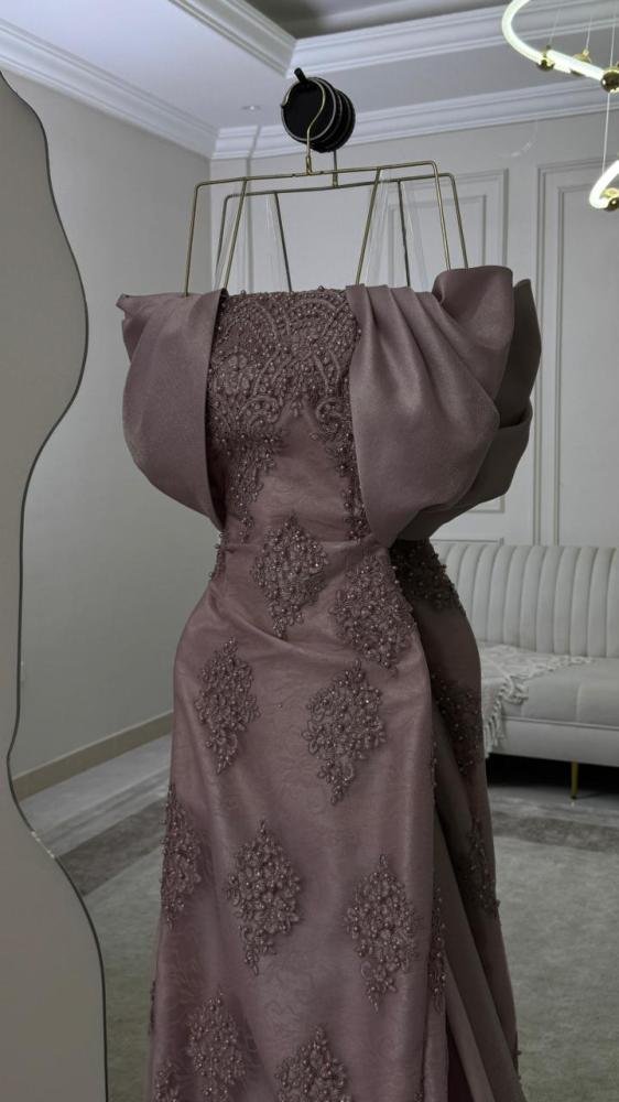 الفستان مزدان بـ تطريز كمبيوتر متقن موزّع بعناية ليخلق تناغمًا بصريًا فاخرًا، يضفي عمقًا وفخامة دون مبالغة، ويجعل القطعة مثالية للمناسبات الراقية والسهرات الرسمية.