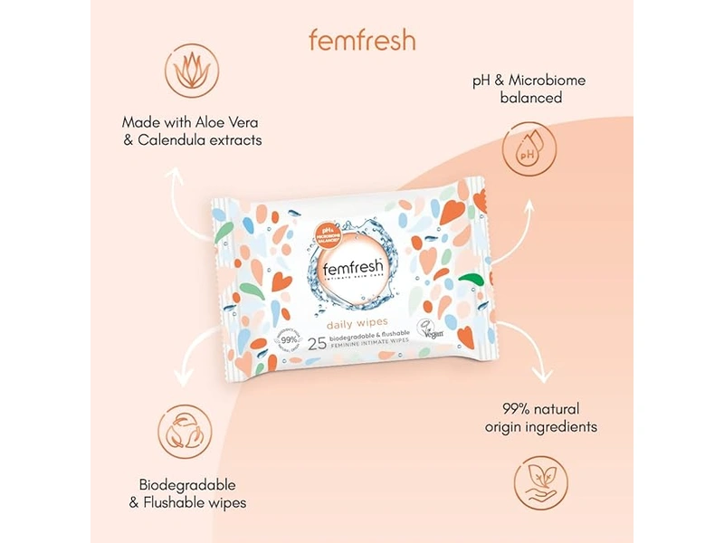Gentle and refreshing feminine wipes to clean the intimate area and provide long-lasting freshness.