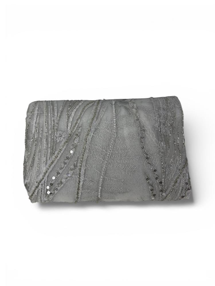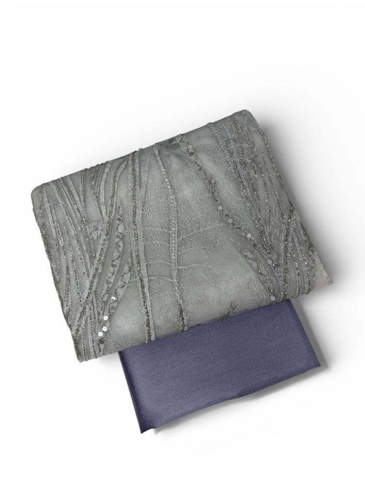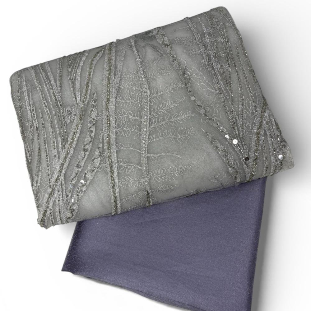 توليفة قماش راقية تعكس الفخامة الهادئة والتصميم العصري، حيث يأتي القماش المطرّز بلون رمادي فضي أنيق مزدان بخطوط طولية متداخلة وتطريزات دقيقة بالترتر تضفي لمسة بريق راقٍ ومتوازن، مع نقوش ناعمة تمنح القماش عمقًا وجاذبية بصرية دون مبالغة. ويكتمل التناغم مع قماش سادة بلون موف أنيق يضيف لمسة دفء ورقي ويمنح حرية أكبر في التصميم.