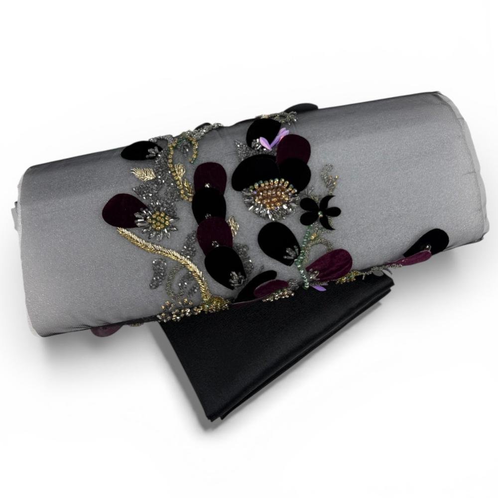 تجمع بين الخرز اللامع، التطريز المعدني، ولمسات ثلاثية الأبعاد بتدرجات الأسود، العنابي، الذهبي، والبنفسجي، لتمنح التصميم فخامة واضحة ولمسة فنية راقية.