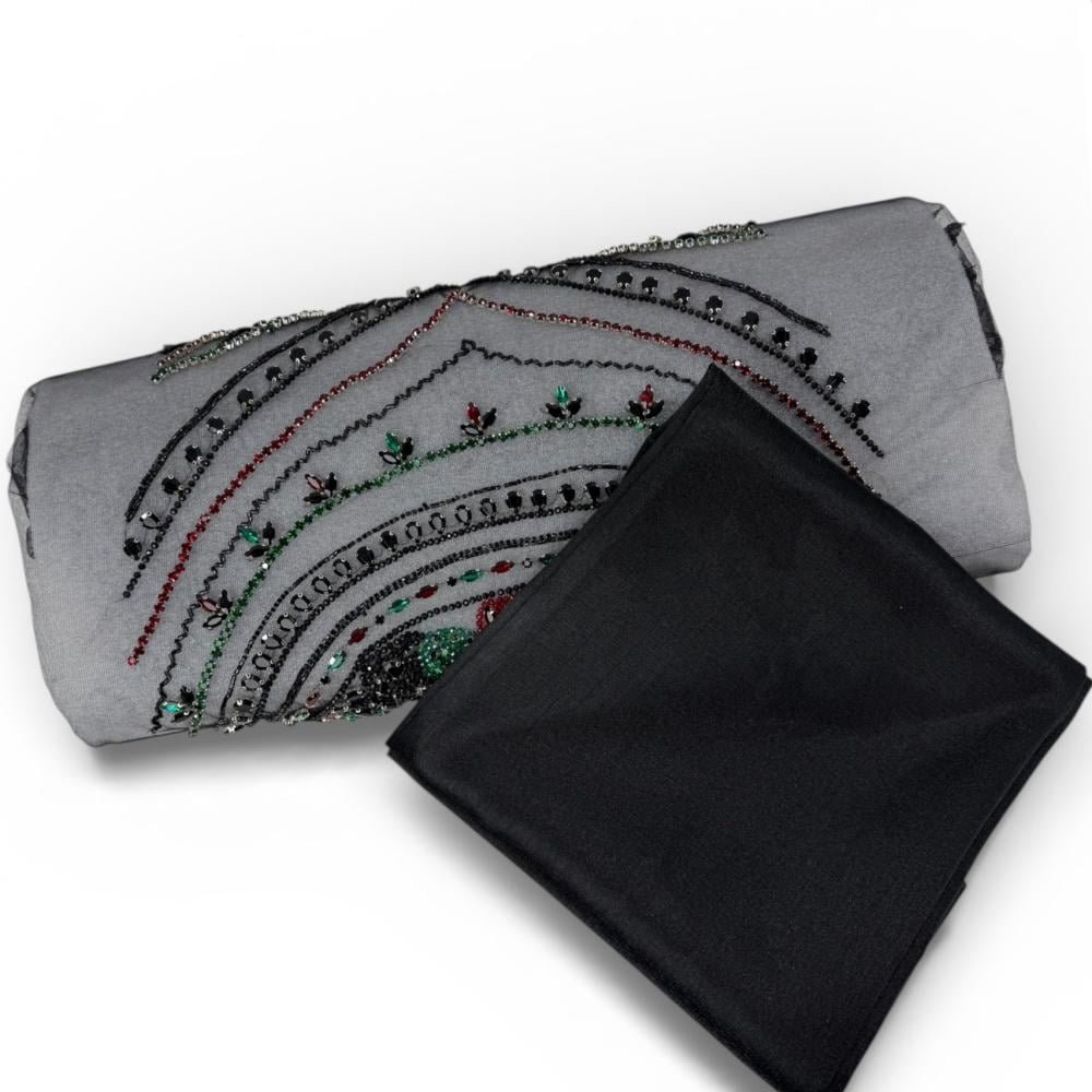 بانو سهرة فاخر مصنوع من شيفون شفاف بلون رمادي دخاني أنيق، مزدان بتطريز يدوي متقن بخطوط من الخرز والترتر بدرجات الأسود، الأخضر الزمردي، والعنابي. تصميمه الانسيابي يمنح القطعة عمقًا بصريًا ولمسة راقية، ليكون خيارًا مثاليًا لفساتين السهرة والمناسبات الخاصة.
