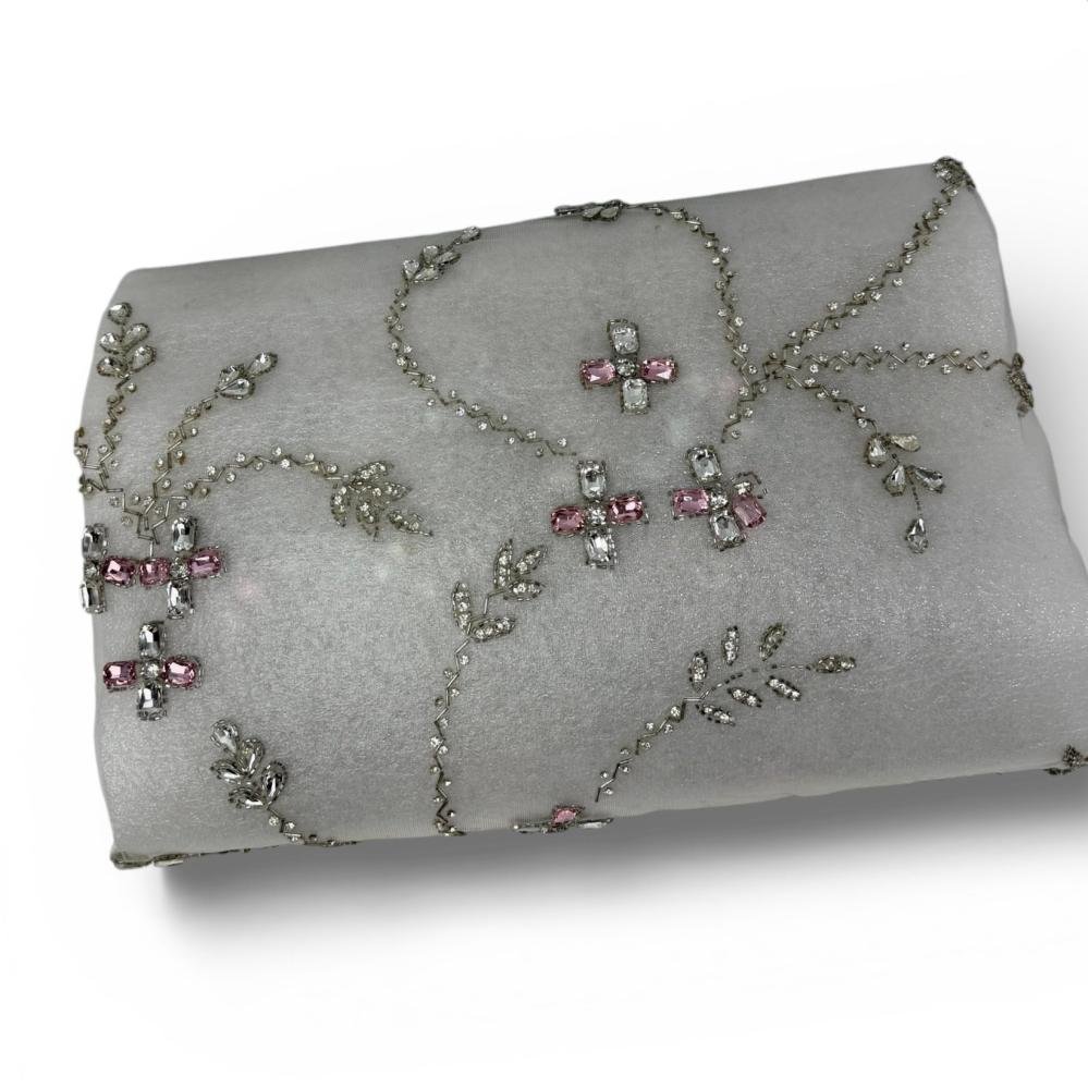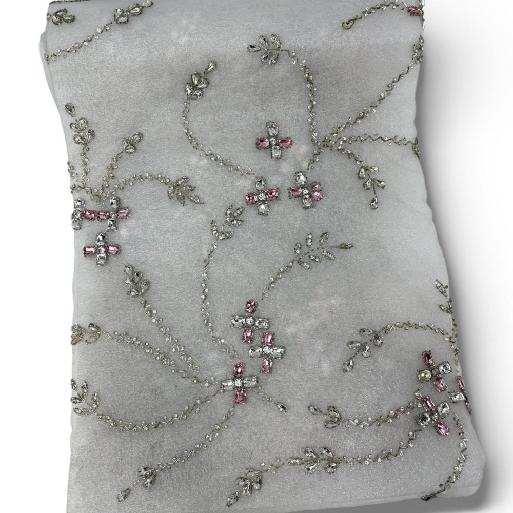 قماش تول فاخر ناعم بلون فضي فاتح مائل للأبيض، مزدان بتطريز انسيابي راقٍ بخيوط فضية دقيقة تتشابك على شكل مسارات ناعمة، تتخللها أحجار كريستالية شفافة ولمسات وردية ناعمة تضيف بريقًا أنثويًا راقيًا ولمسة فنية متقنة. توزيع التطريز متوازن ويمنح القماش حركة وأناقة عند الارتداء.