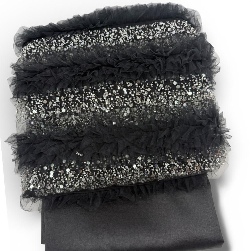 فخامة جريئة… تفيض حضورًا وأناقة 🖤✨ قماش تول مطرز بتصميم استثنائي يجمع بين الجرأة والفخامة، بلون أسود عميق تتناوب عليه طبقات من الكشكش الناعم مع صفوف كثيفة من الترتر اللامع، في توزيع أفقي متوازن يمنح القماش بُعدًا بصريًا فاخرًا وحضورًا قويًا يخطف الأنظار.