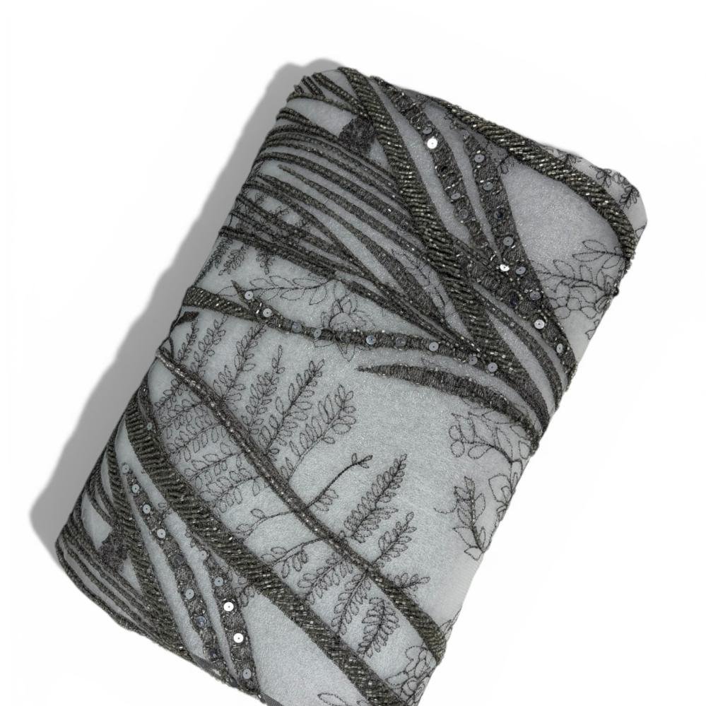 قطعة قماش تول مطرز بزخارف نباتية – رمادي ناعم 3متر