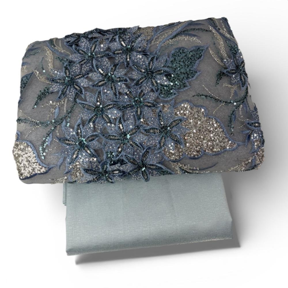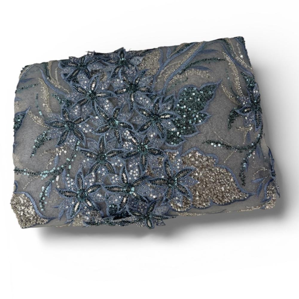 قماش تول مطرز زهور – أزرق رماديقماش تول مطرز بتصميم زهور ثلاثية الأبعاد وتفاصيل ترتر لامعة تضيف لمسة فخامة وأناقة. يتميز بلونه الأزرق الرمادي الراقي وخامته الناعمة المناسبة للتصميم والخياطة.