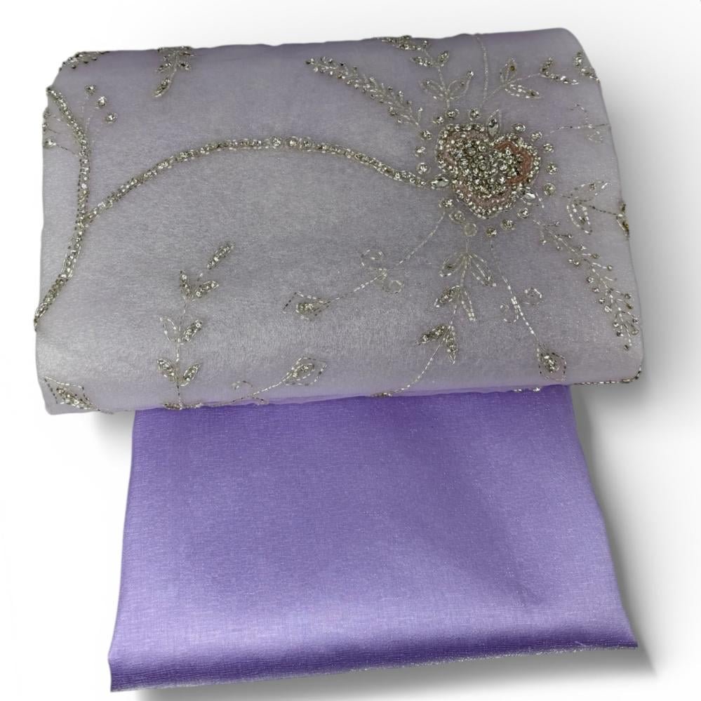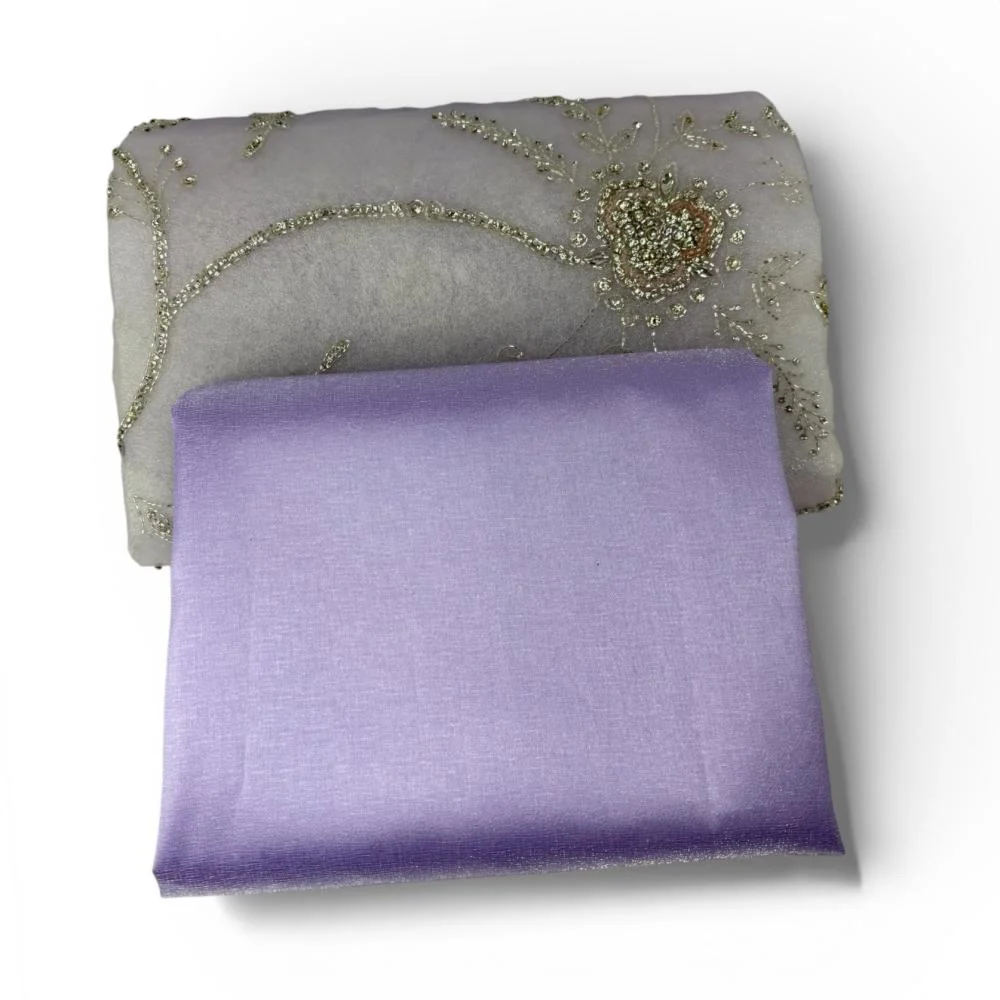 ويكتمل الجمال مع قماش سادة بلون بنفسجي ناعم ومشرق، يمنح التصميم عمقًا وأناقة إضافية، ويُعد خيارًا مثاليًا للتبطين أو إبراز القصّات الهادئة، مما يخلق توازنًا متناغمًا بين الفخامة والنعومة.