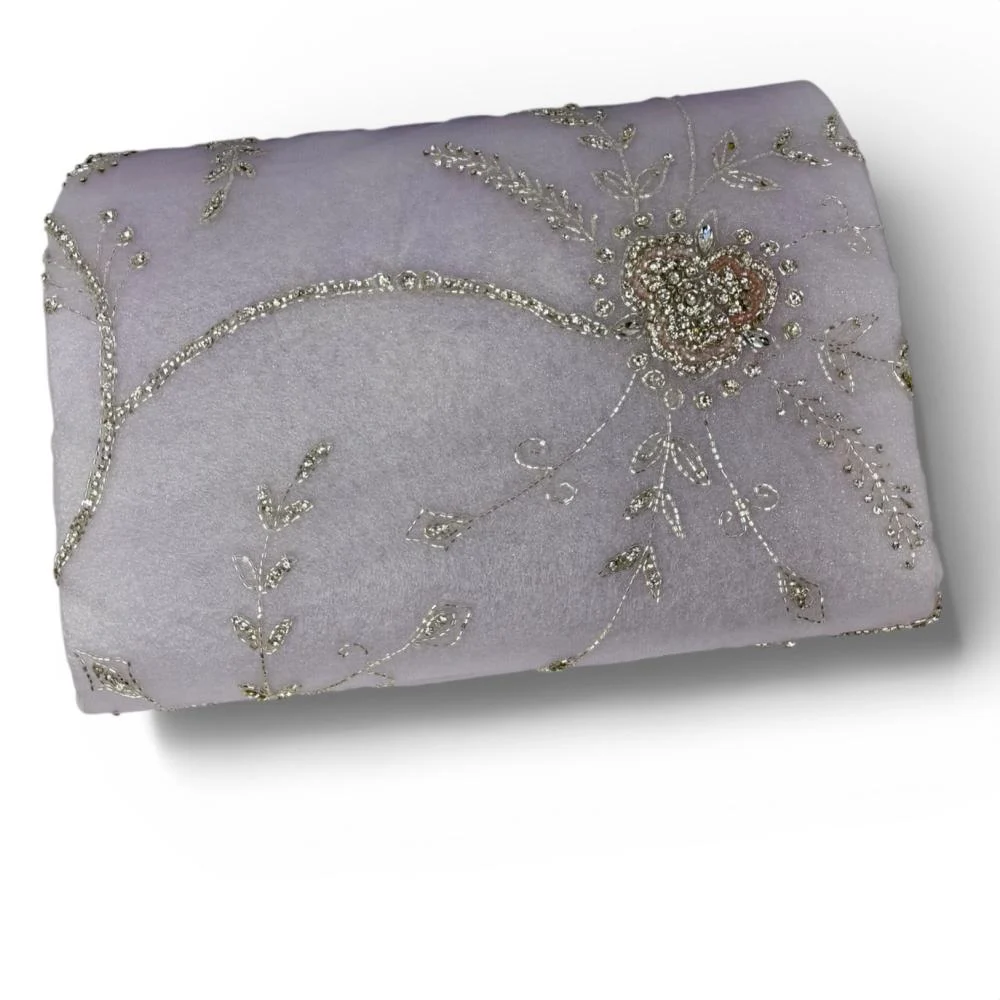 توليفة قماش تنطق بالرقي والأنوثة الراقية، صُممت لتخاطب الذوق الرفيع وتلهم تصاميم فاخرة بتفاصيل ناعمة. يأتي القماش المطرّز بلون موف رمادي هادئ، مزدان بتطريزات نباتية أنيقة بخيوط لامعة وحبيبات دقيقة تتشكل في تناغم انسيابي، مع وردة مركزية فاخرة تضيف لمسة فنية راقية وتفاصيل آسرة تلفت النظر برقي.