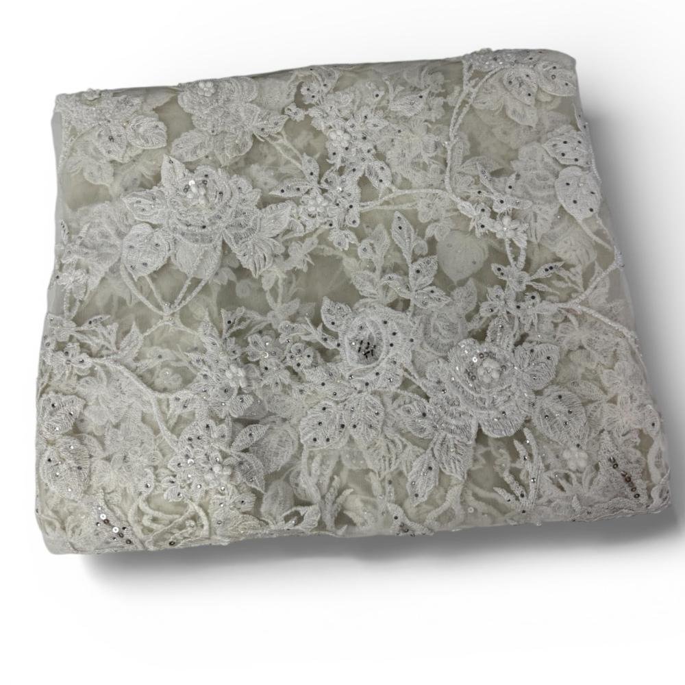 الدانتيل شفاف بخفة متوازنة وملمس ناعم، ما يجعله خيارًا مثاليًا لتصاميم فساتين الزفاف والخطوبة والسهرات الراقية، خاصة لمن تبحث عن أناقة أنثوية راقية وتفاصيل فخمة ناعمة.