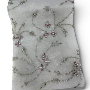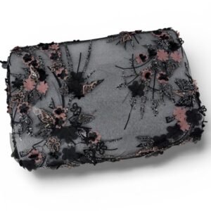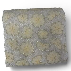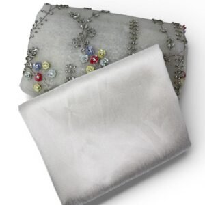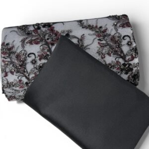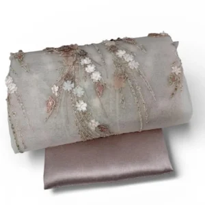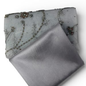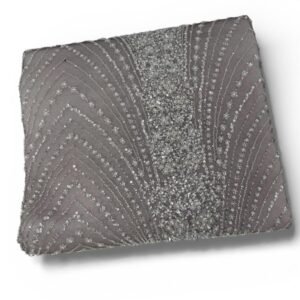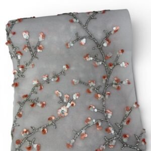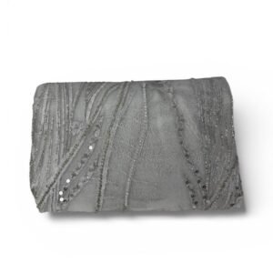 قطعة قماش فاخرة بتصميم أنيق يجمع بين الرقي والتميز، تتميز بقاعدة بلون فضي هادئ مع لمعة ناعمة تضيف إحساسًا بالفخامة. يزينها تطريز بارز بتصاميم نباتية غنية بالتفاصيل، منفذة بخيوط داكنة ومطعمة بالخرز والترتر اللامع، ما يمنحها بعدًا ثلاثي الأبعاد ولمسة فنية جذابة.