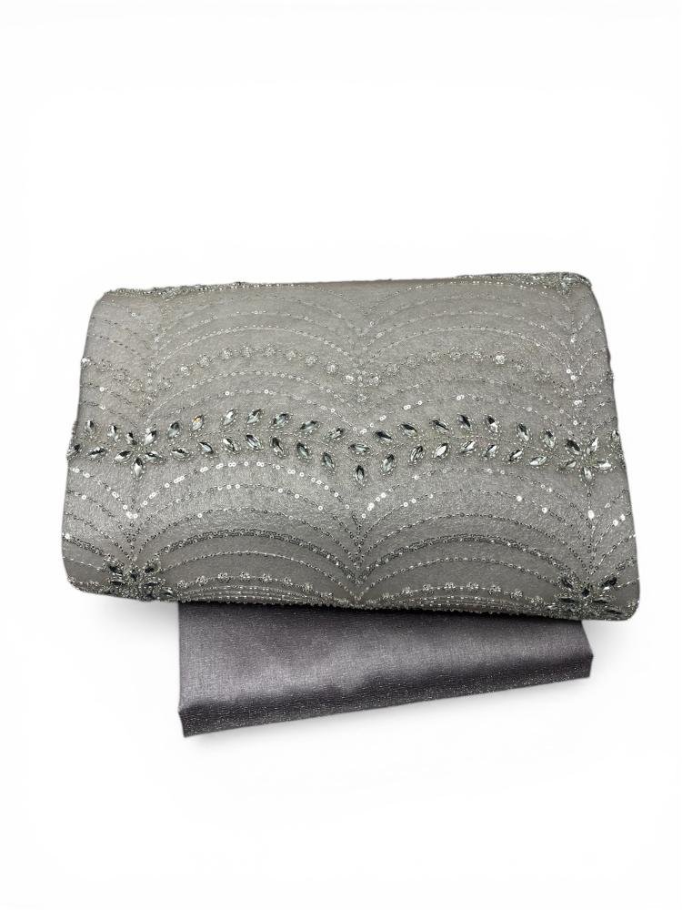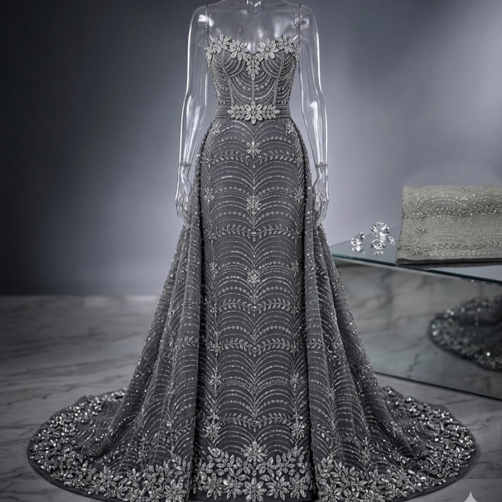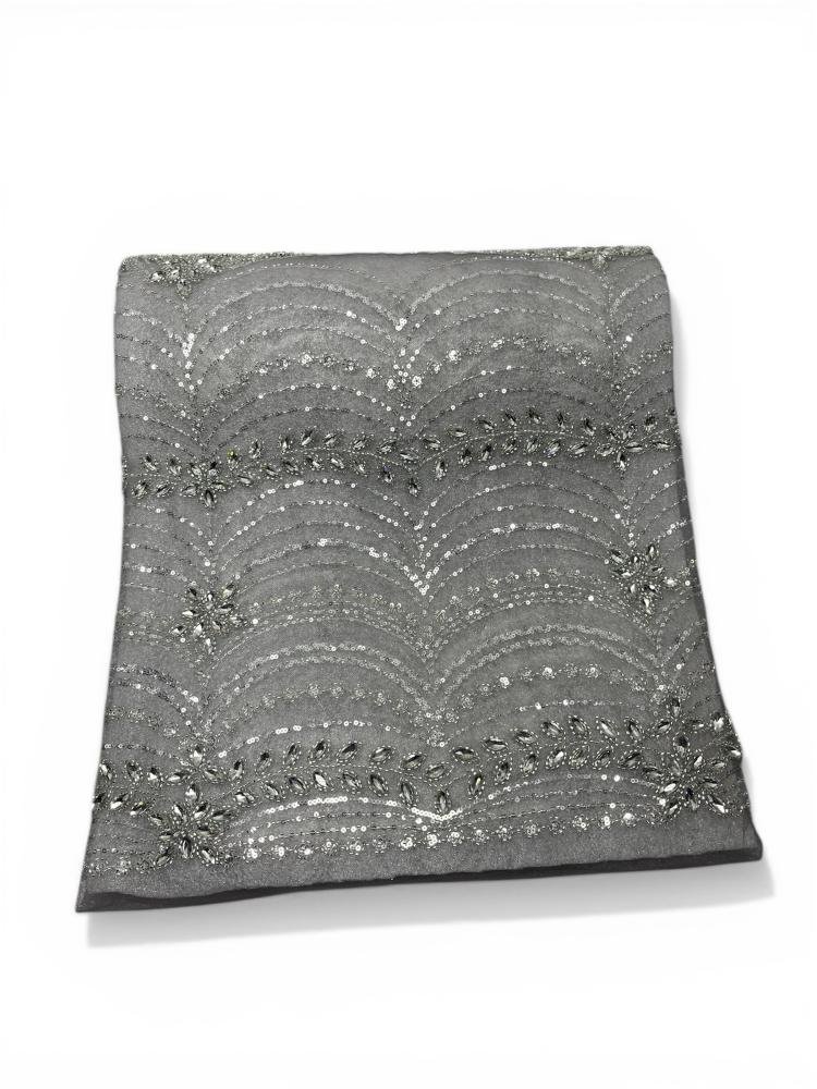 هذه الخامة الفضية ليست مجرد قماش، بل لوحة فنية متقنة التفاصيل؛ حيث تنساب خطوط التطريز على شكل تموجات متناغمة تمنح إحساسًا بالحركة والنعومة. تتداخل حبات الترتر الدقيقة مع أحجار كريستالية مصفوفة بعناية لتشكّل زخارف تشبه النجوم المتلألئة وأغصانًا أنيقة تمتد بانسيابية عبر القماش.