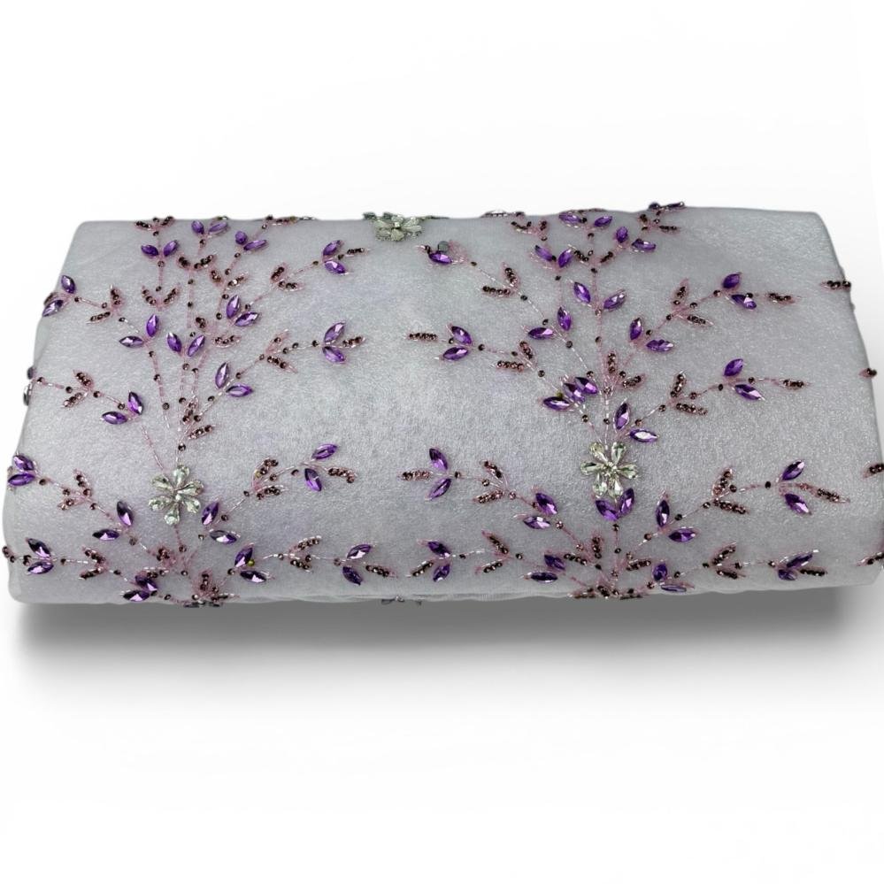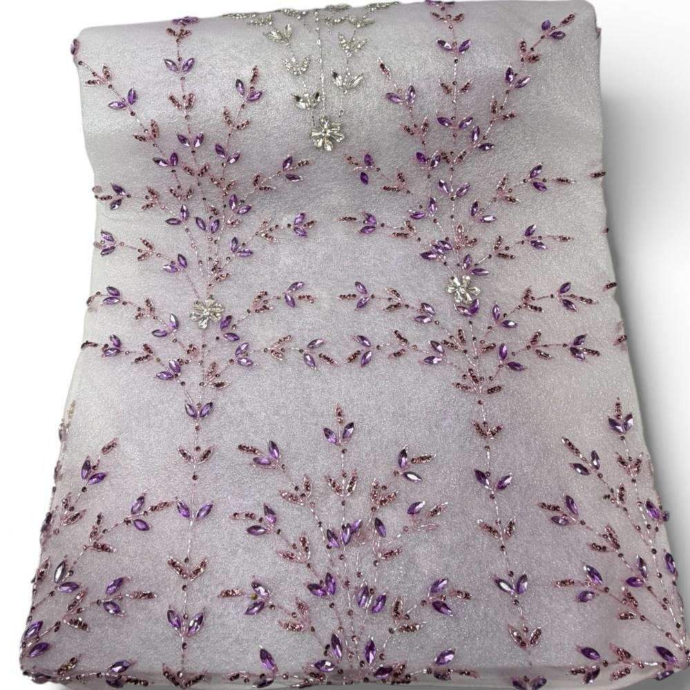 قماش من التول الناعم مطرّز بشكّ يدوي دقيق على هيئة زخارف نباتية متناغمة، مستخدم فيه خرز وأحجار لامعة بدرجات الموف مع لمسات فضية رقيقة، تعكس الضوء بشكل ناعم وتبرز جمال التصميم بدون مبالغة. أرضية القماش شفافة وخفيفة، ما يمنحه انسيابية رائعة عند التفصيل.