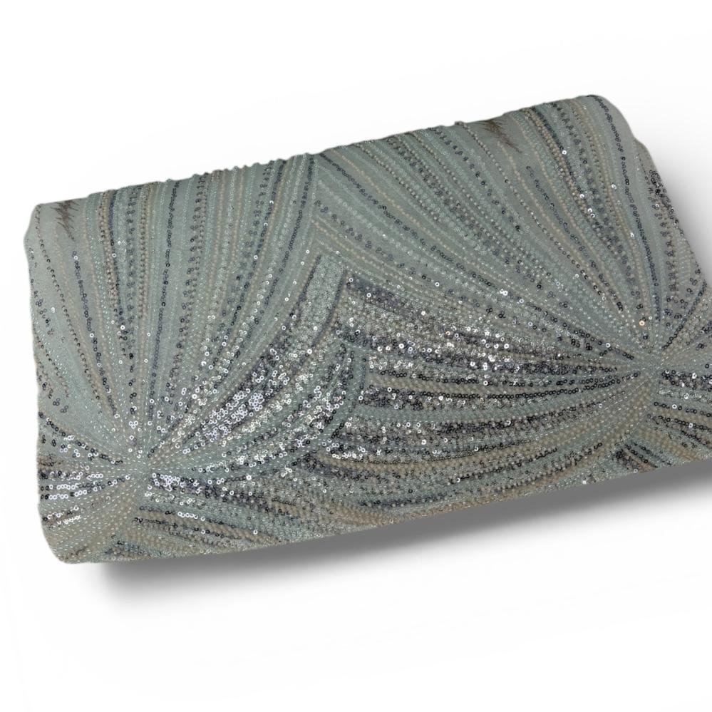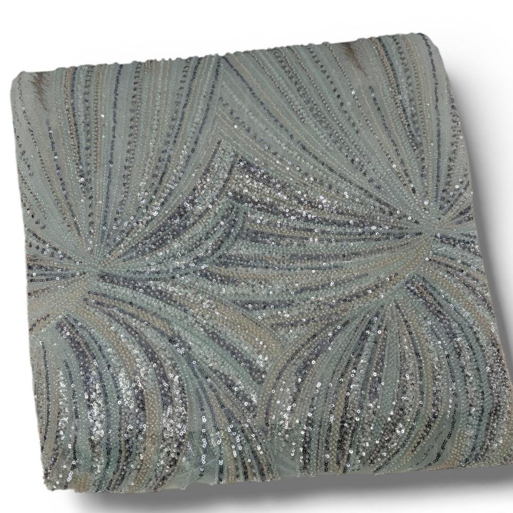 قماش مطرّز فاخر بتصميم هندسي انسيابي ينبض بالأناقة، تتداخل فيه خطوط الترتر اللامعة بتوزيع متقن يمنح القطعة عمقًا بصريًا وحركة ساحرة مع انعكاس الضوء. اللون الهادئ المائل للفضي الرمادي يضفي فخامة راقية، ويجعل القماش خيارًا مثاليًا للإطلالات المسائية الراقية والمناسبات الخاصة.