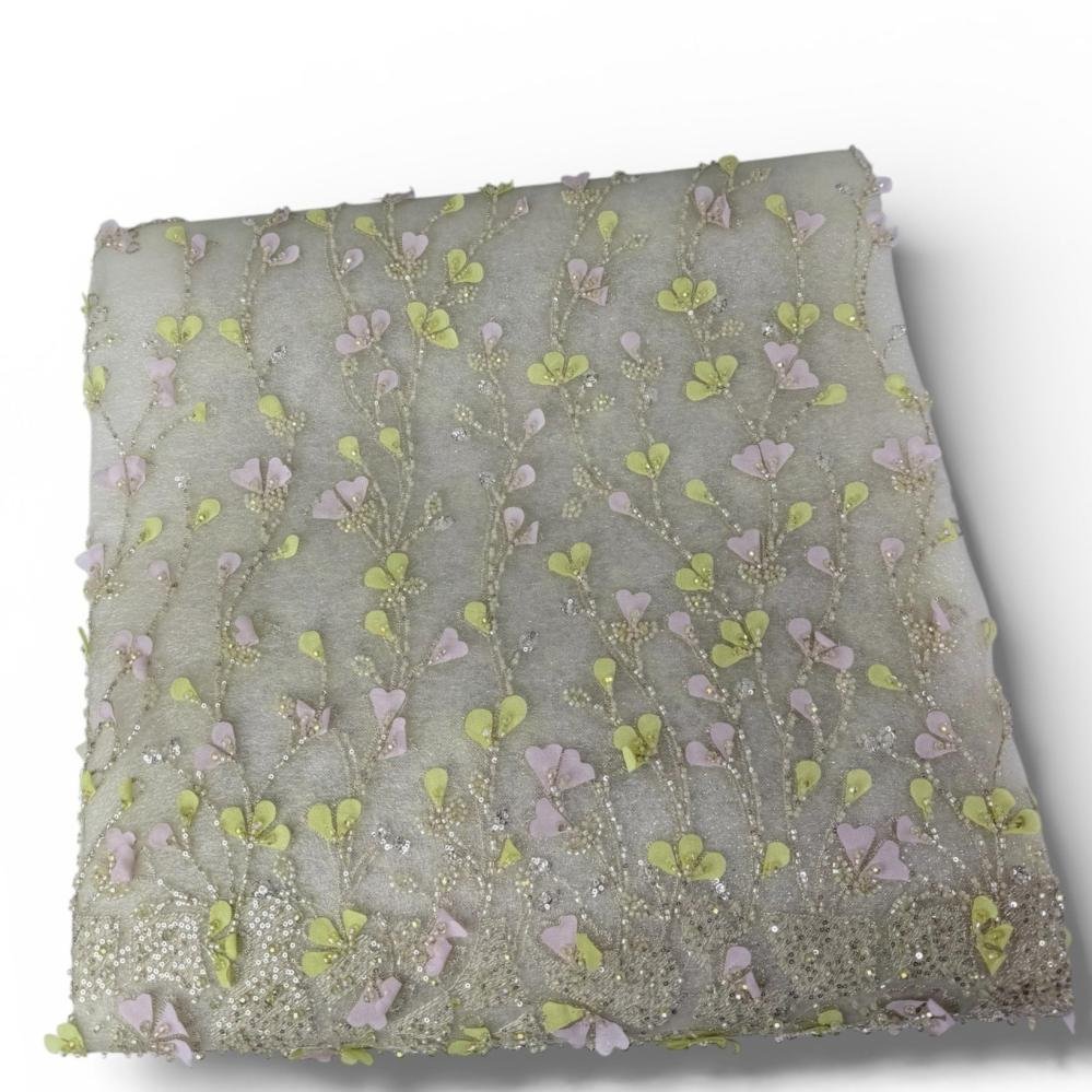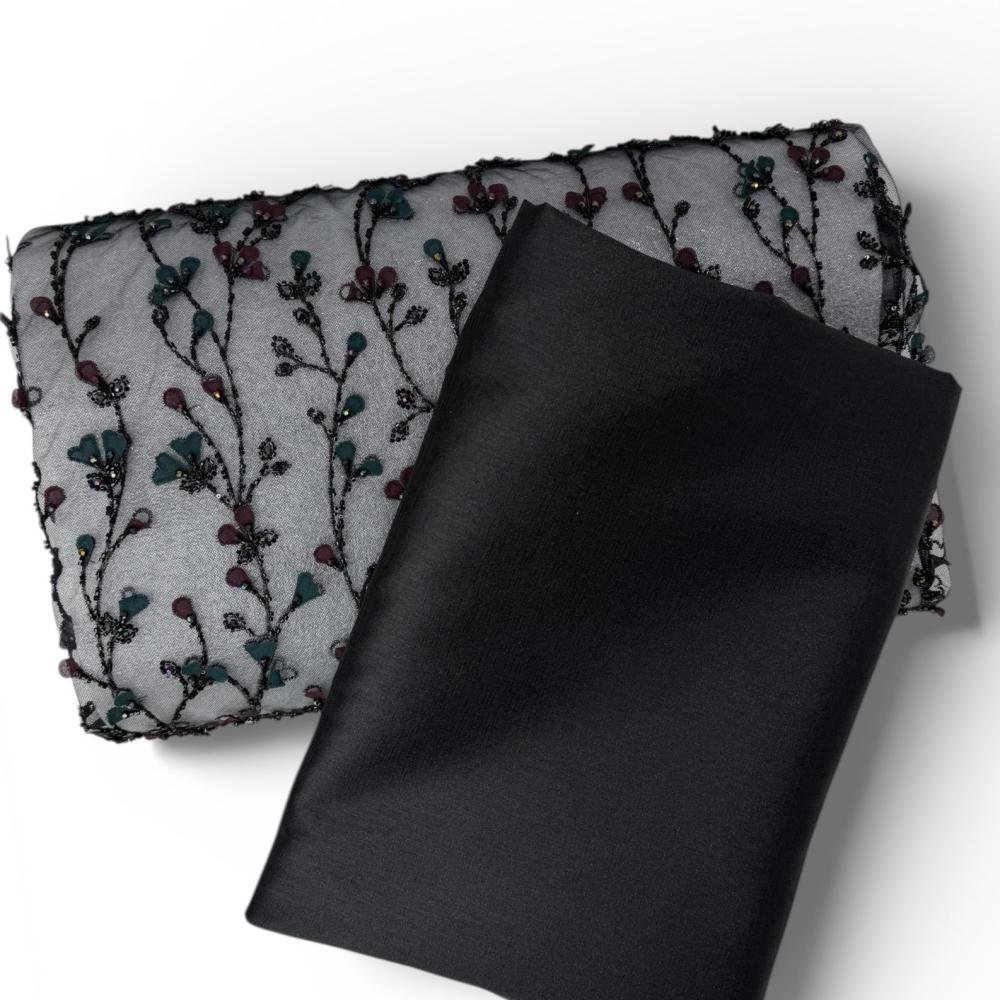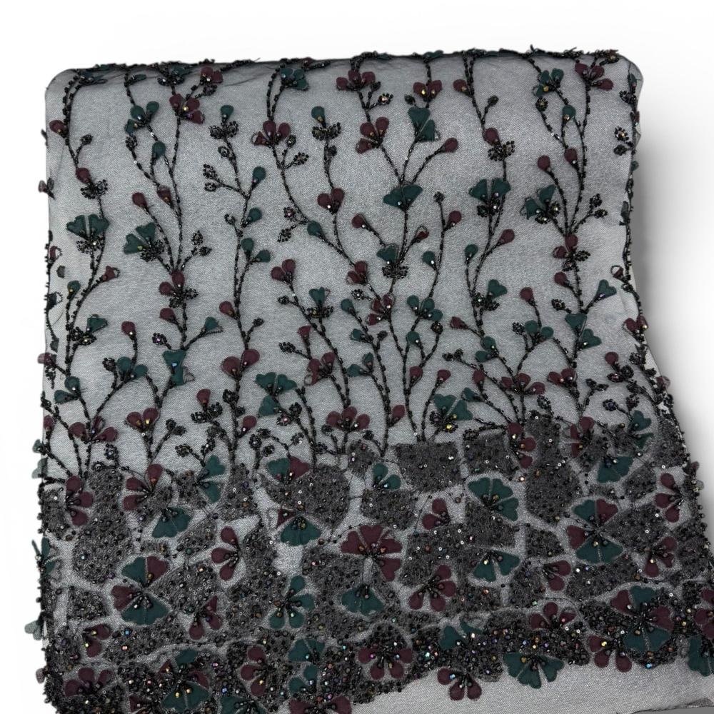 قماش تول ناعم فاخر بلون رمادي فاتح مائل للفضي، مزخرف بتطريز انسيابي رقيق تتخلله نقوش قلبية صغيرة بألوان الأخضر الفاتح والبنفسجي الناعم، مع لمسات ترتر دقيقة تضيف بريقًا خفيفًا وجذابًا. ويأتي مع القطعة قماش ساتان بلون أخضر فاتح متناسق، مثالي للتبطين ويمنح التصميم انسجامًا لونيًا أنيقًا.