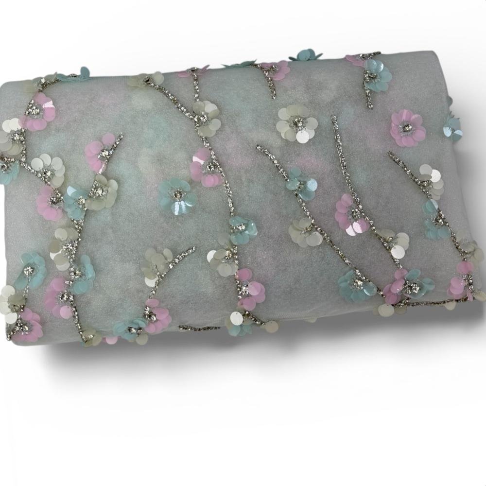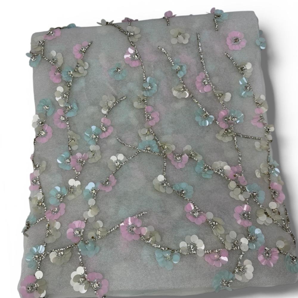 قماش فاخر بخامة التول الخفيف، بلون رمادي فضي هادئ يمنح إحساسًا بالرقي والنعومة. يتميز بتطريز زهور ثلاثية الأبعاد بدرجات الوردي الباستيل، الأزرق السماوي، والعاجي، تتخللها خيوط لامعة رفيعة تضيف لمسة أنيقة دون مبالغة.
