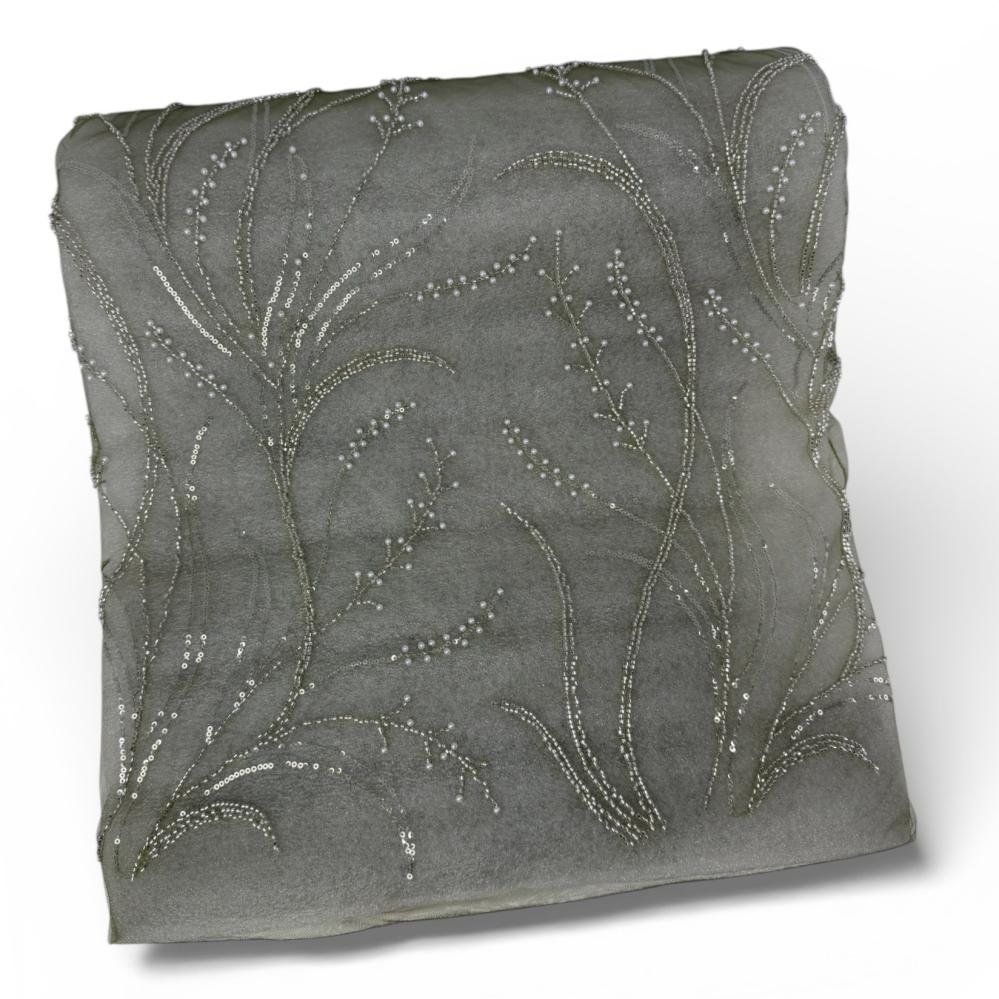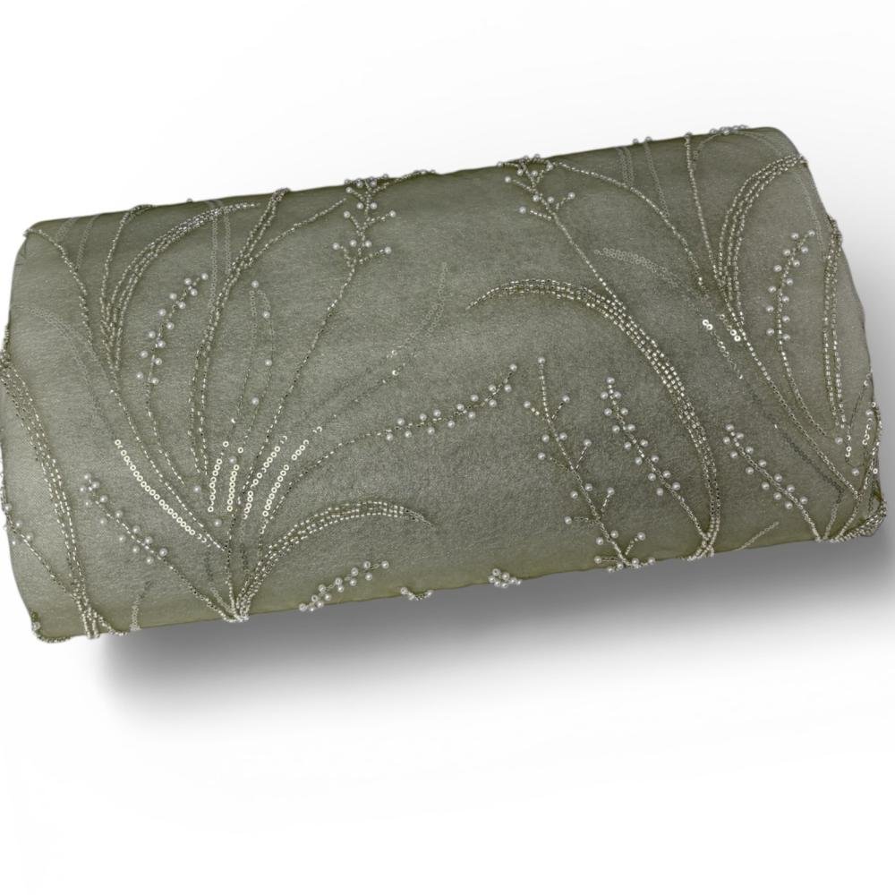 تولًا مطرّزًا بلمسة راقية وتصميم متقن يعكس أناقة التفاصيل ودقّة الحرفية. هذا القماش يأتي بلون رمادي غامق مائل للأخضر الزيتوني، يمنح إحساسًا بالفخامة الهادئة ويُبرز جمال التطريز بشكل متوازن وأنيق.