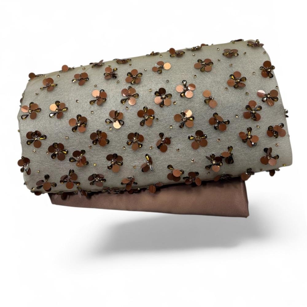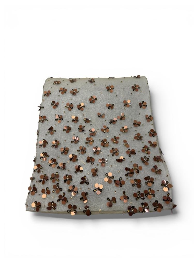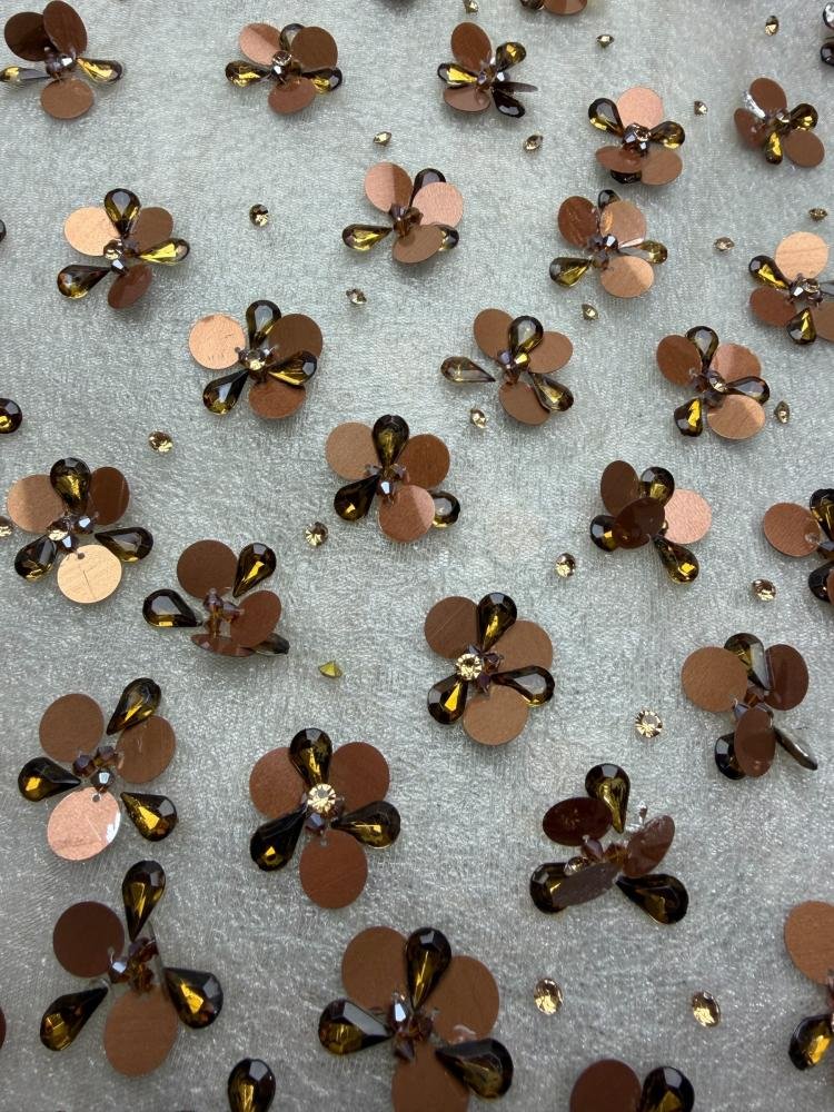 نسيجٌ راقٍ بلونٍ حيادي أنيق، تتناثر فوقه زخارف زهرية دقيقة، مطرّزة بعناصر لامعة بدرجات نحاسية دافئة، تعكس الضوء بانسيابية وتمنح القماش حضورًا بصريًا أخّاذًا.