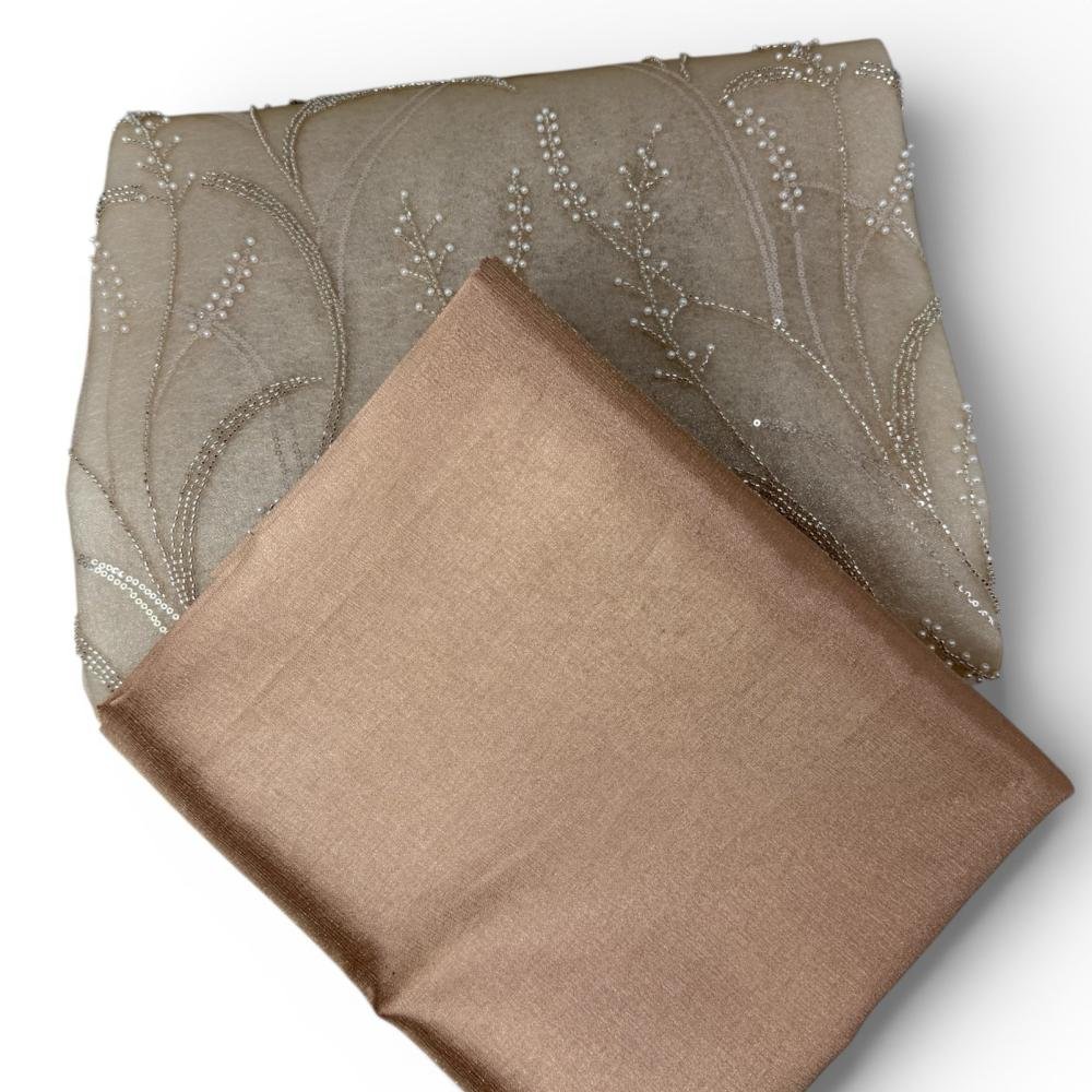 هذا القماش المطرّز بتصميم أنيق يجمع بين البساطة والفخامة، حيث تأتي القاعدة بلون بيج رمادي ناعم يمنح إحساسًا دافئًا وراقيًا في آنٍ واحد.
