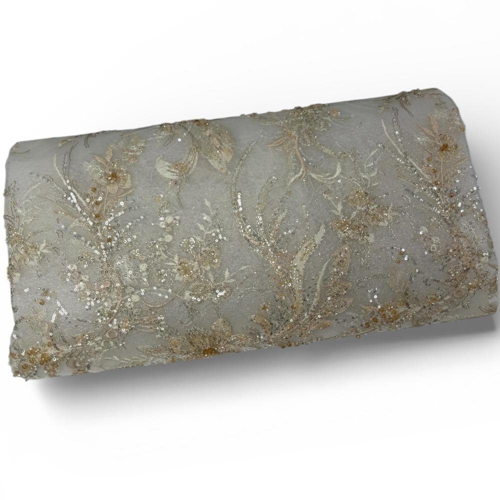 نضع بين يديك تحفة نسيجية تنطق بالفخامة، قماش صُمّم ليكون العنوان الأول للأناقة الراقية. قاعدة تول رمادية ناعمة، تنساب بخفة وتمنح إحساسًا بالهدوء والرقي، تتزين بتطريزات فاخرة بلون ذهبي شمبانيا متوهّج يعكس الضوء بأسلوب راقٍ وغير مبالغ فيه.