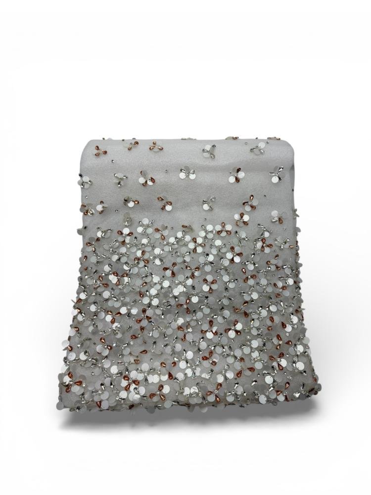 قماشٌ بلونٍ فضيّ لؤلؤي هادئ، تتكاثف فوقه زخارف دائرية وزهرية لامعة بتدرّج متقن، تبدأ متناثرة برقة في الأعلى ثم تتكاثف بسخاء في الأسفل، لتصنع لوحة فنية تنبض بالفخامة والحضور.