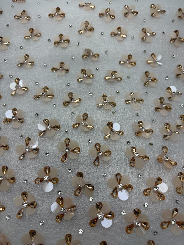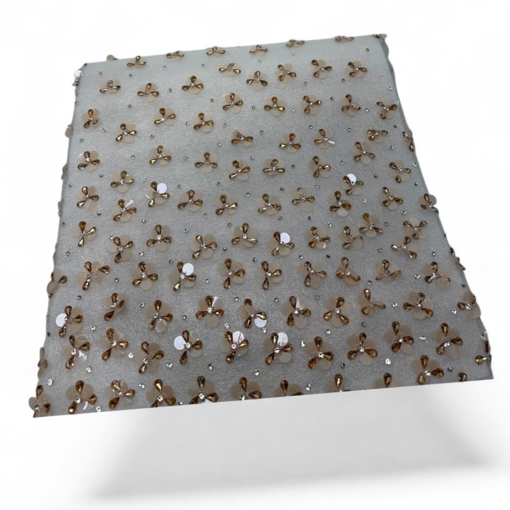 صُمِّمت الزهور بأسلوب متناثر ومنتظم في آنٍ واحد، ما يمنح القماش اتساعًا بصريًا ولمسة فنية ناعمة، بينما تضيف الأحجار الدقيقة بريقًا خفيفًا يعكس الضوء برقيّ دون مبالغة.