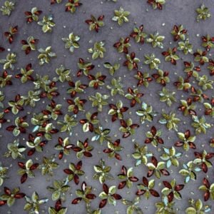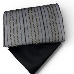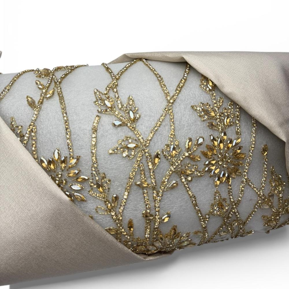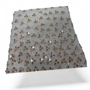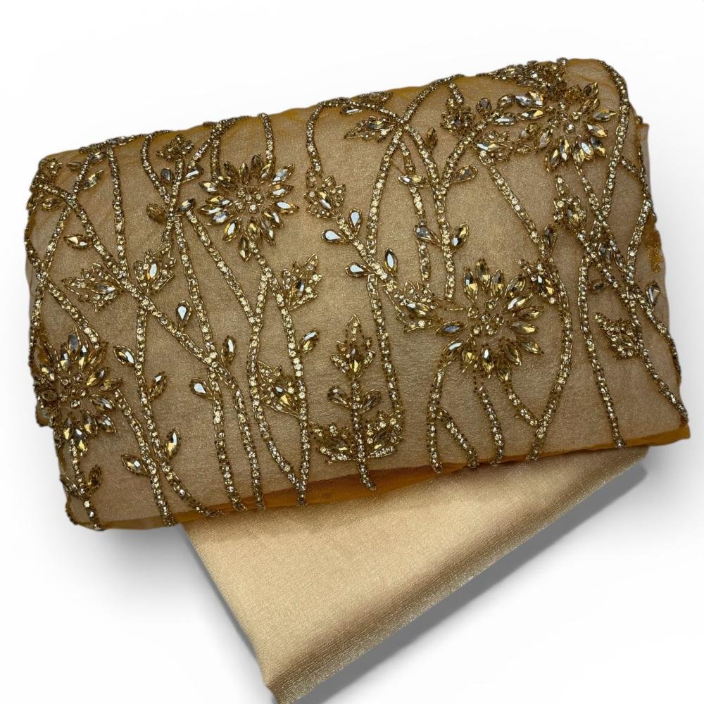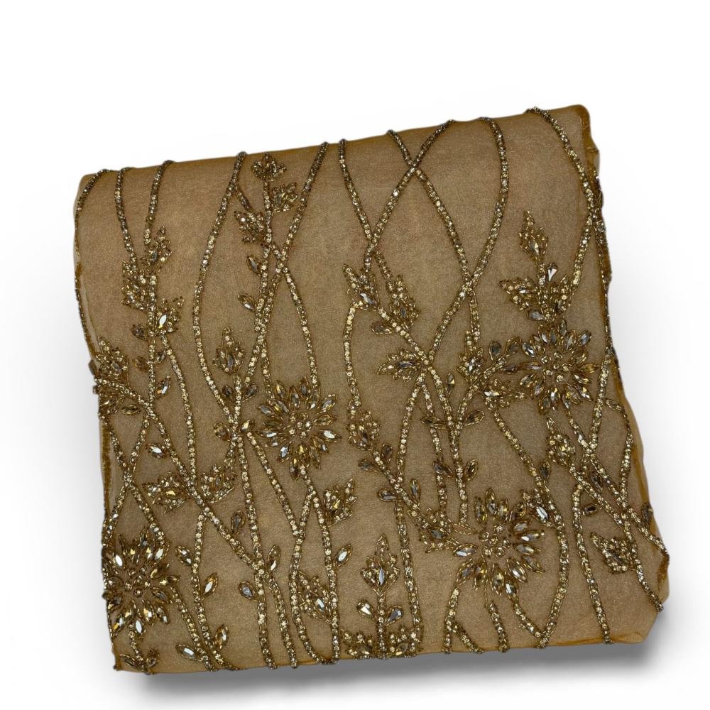 قماش مطرّز بلمسة ملكية يخطف الأنظار من النظرة الأولى، حيث تتراقص الزخارف النباتية المذهّبة على قاعدة ناعمة بلون دافئ يوحي بالفخامة والرقي. تطريزات دقيقة تنساب بخطوط متداخلة، تتخللها تفاصيل براقة تضيف عمقًا ولمعانًا راقيًا، لتمنح القطعة حضورًا فخمًا يليق بالمناسبات الاستثنائية.