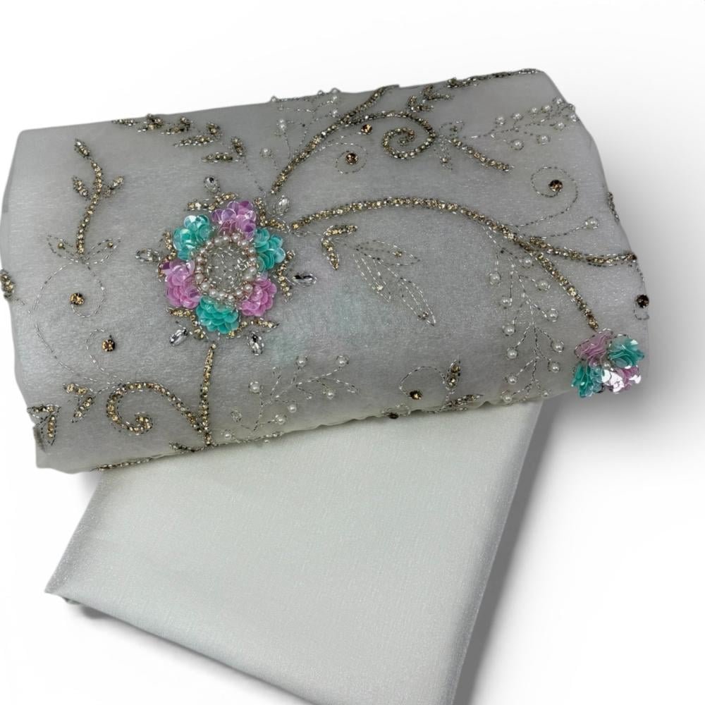 اكتشفي فخامة التفاصيل مع قماش تول مطرز بتطريز يدوي فاخر ، يتميز بخلفية رمادية أنيقة مزينة بنقوش نباتية ناعمة بخيوط ذهبية ولمسات لؤلؤية لامعة، تتخللها ورود ثلاثية الأبعاد بدرجات التركواز والبنفسجي تضيف بعدًا فنيًا راقيًا ولمسة أنثوية ساحرة.