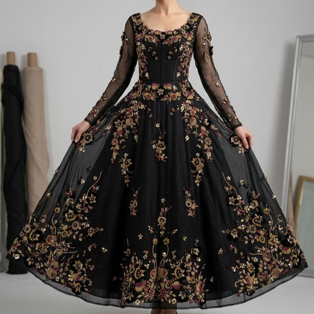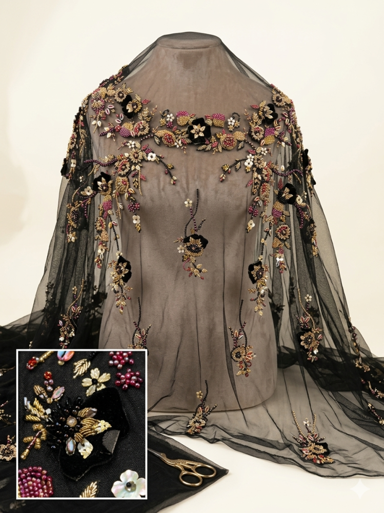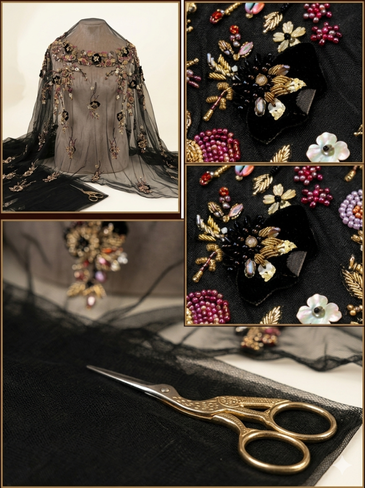 قطعة قماش كلوش فاخرة بتصميم راقٍ على قماش شفاف باللون الأسود، مزينة بتطريز يدوي غني من الخرز والكريستال والترتر بتفاصيل دقيقة ولمسات ذهبية جذابة. تأتي مع صدرية قابلة للتعديل تناسب مختلف المقاسات، لتمنحك مرونة عالية في تصميم فساتين السهرة والمناسبات بإطلالة فاخرة ومميزة.