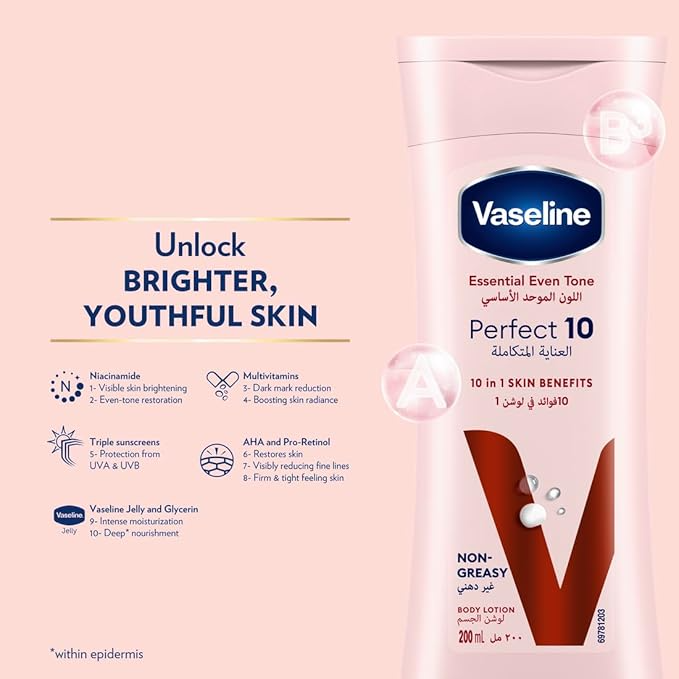لوشن فازلين بيرفكت 10 يمنح البشرة ترطيبًا مكثفًا بفضل تركيبته المغذية التي تعمل على تحسين نعومة ومرونة الجلد. يساعد على توحيد الملمس ومنح إشراقة صحية تدوم طوال اليوم. تركيبته خفيفة وسريعة الامتصاص، ما يجعله مناسبًا للاستخدام اليومي لجميع أنواع البشرة.