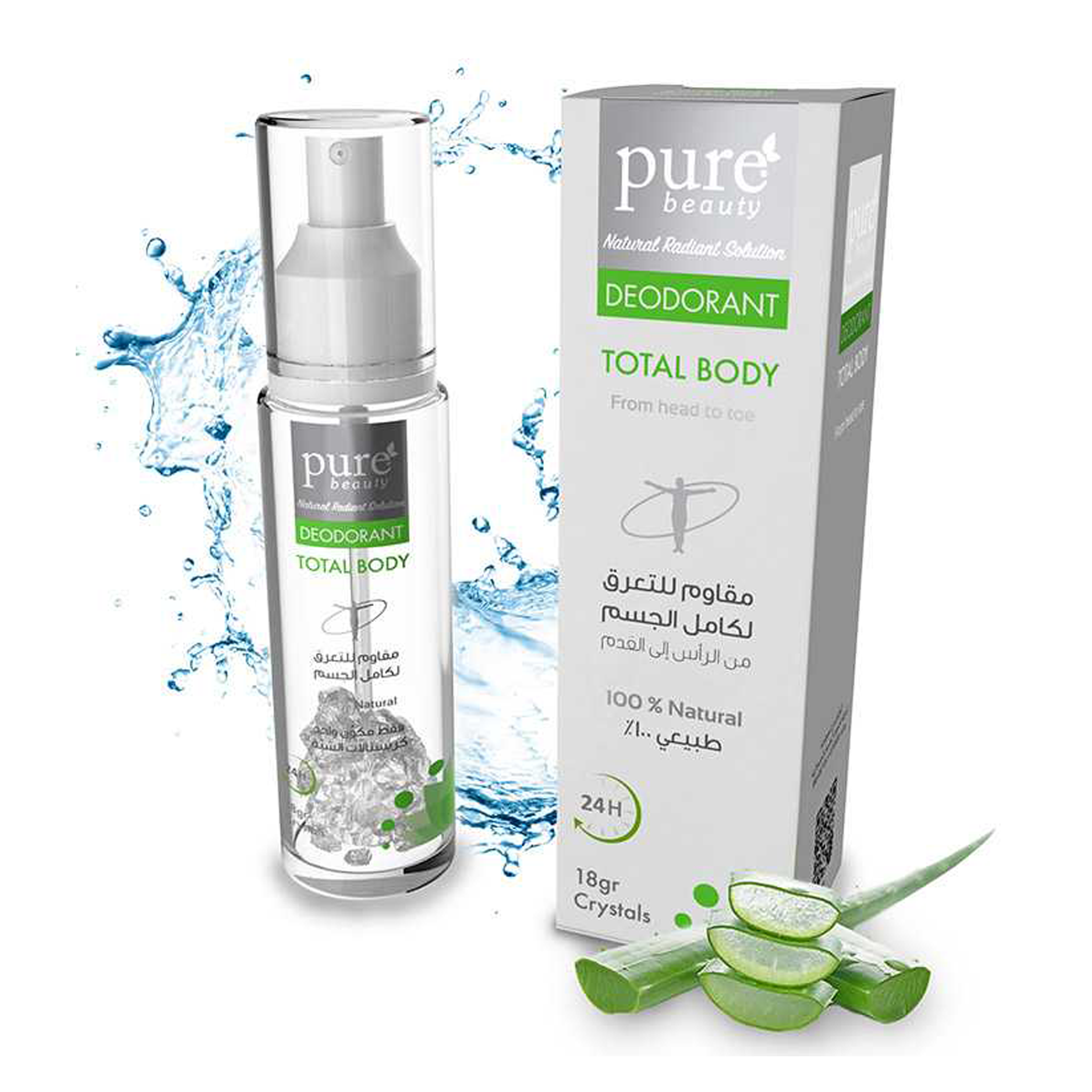مزيل عرق من ماركة بيور بيوتي يُستخدم من الرأس حتى القدم، تركيبة طبيعية 100٪ تعتمد على بلورات الألوم والماء فقط، تساعد في تقليل نمو البكتيريا المسببة للروائح دون التأثير على التوازن الطبيعي للبشرة.