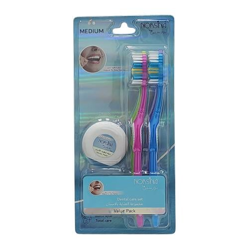 طقم نورسين فرشاة أسنان مع خيط أسنان مصمم لتوفير عناية متكاملة بالفم. تساعد فرشاة الأسنان على تنظيف الأسنان وإزالة البلاك، بينما يعمل خيط الأسنان على تنظيف المناطق بين الأسنان التي يصعب الوصول إليها بالفرشاة، مما يساهم في الحفاظ على صحة اللثة ونظافة الفم بشكل يومي.